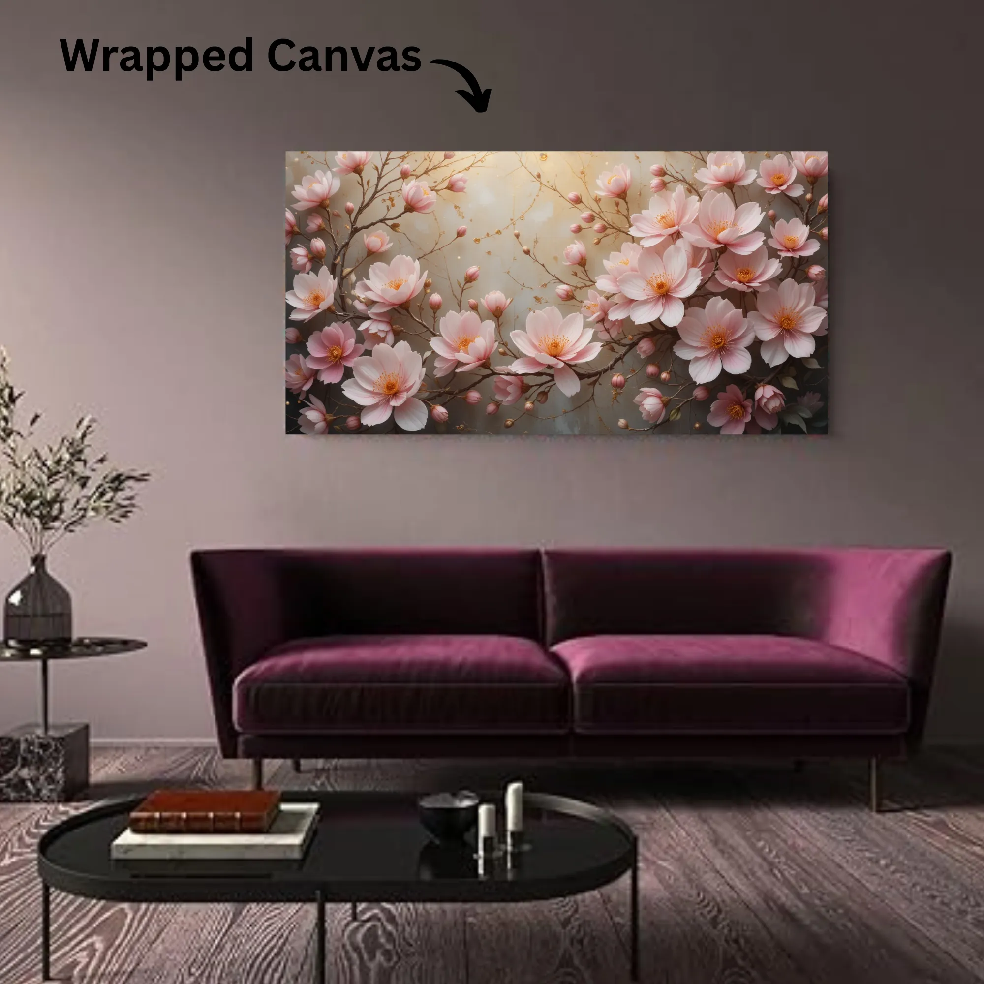 Blossom Dreamscape is a designer cotton canvas art print, created to add romance, grace, and timeless beauty to interior décor. With soft pink cherry blossoms blooming against a velvety neutral background, the piece radiates feelings of peace and gentle sophistication