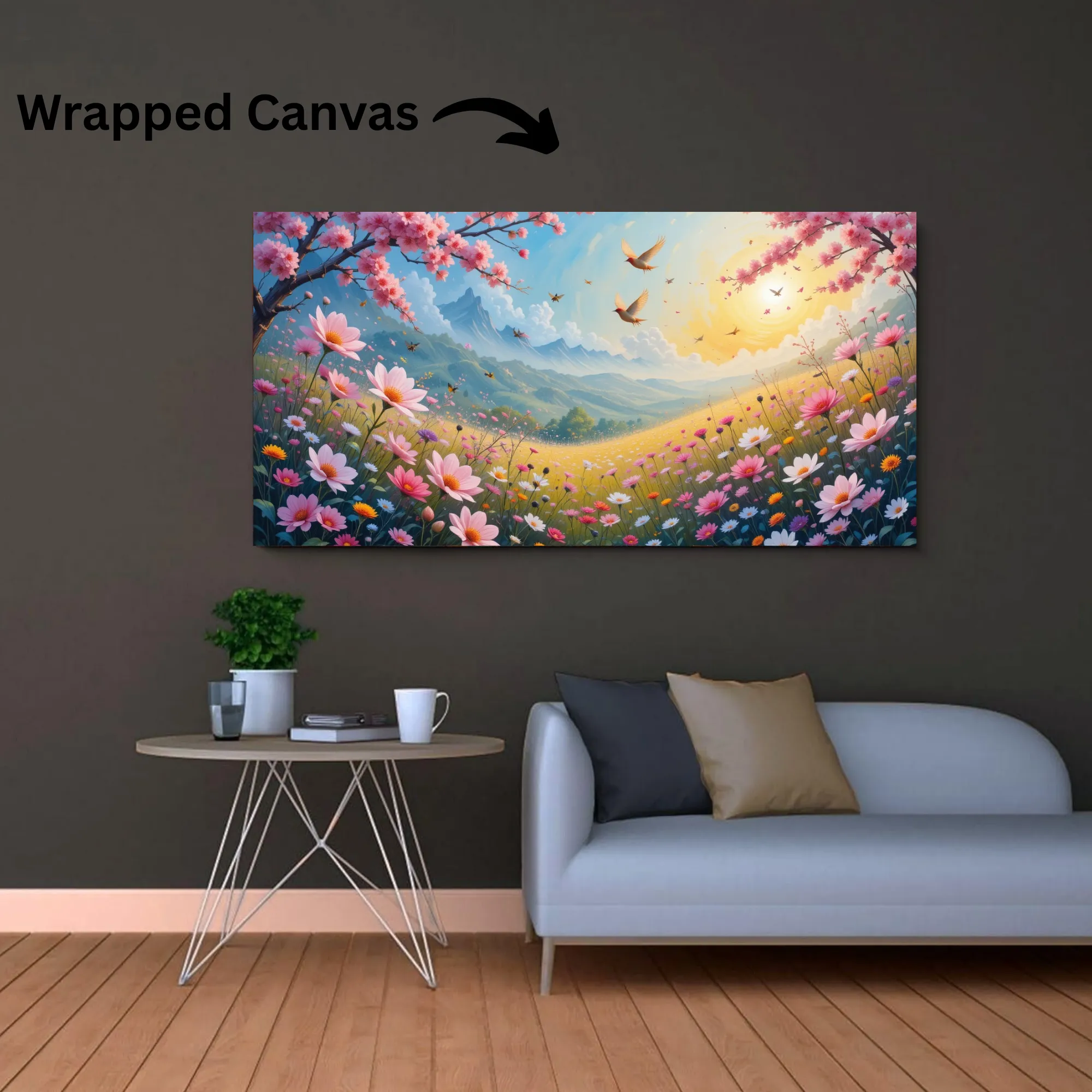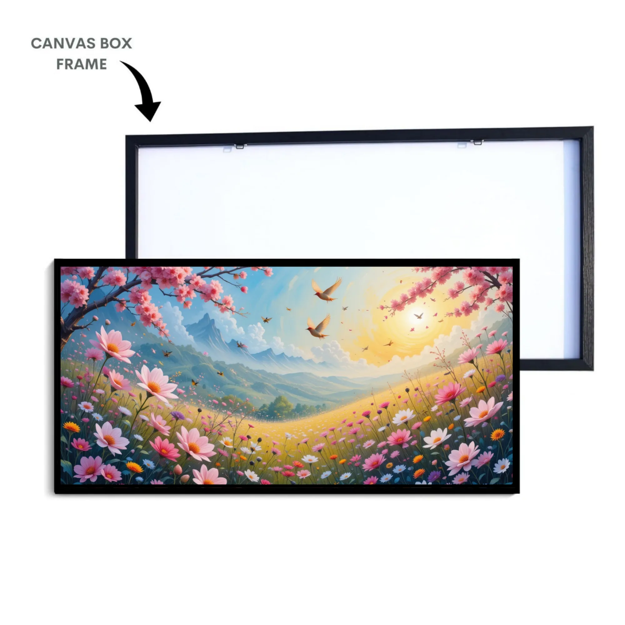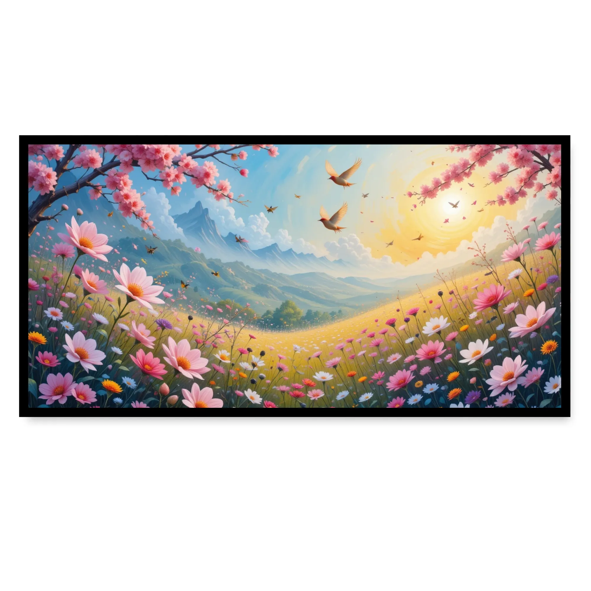 This enchanting artwork captures the magic of a spring morning, where nature blooms in a symphony of colors. The scene features a golden sunrise casting a warm glow over rolling hills, vibrant wildflowers, and cherry blossoms in full bloom. Birds soar gracefully in the bright sky, adding a sense of freedom and harmony to the composition. The soft pastel tones of pinks, yellows, and greens are beautifully balanced with golden sunlight, creating a joyful and uplifting atmosphere. Perfect for brightening up any living space, this piece symbolizes new beginnings, positivity, and the beauty of nature’s renewal.