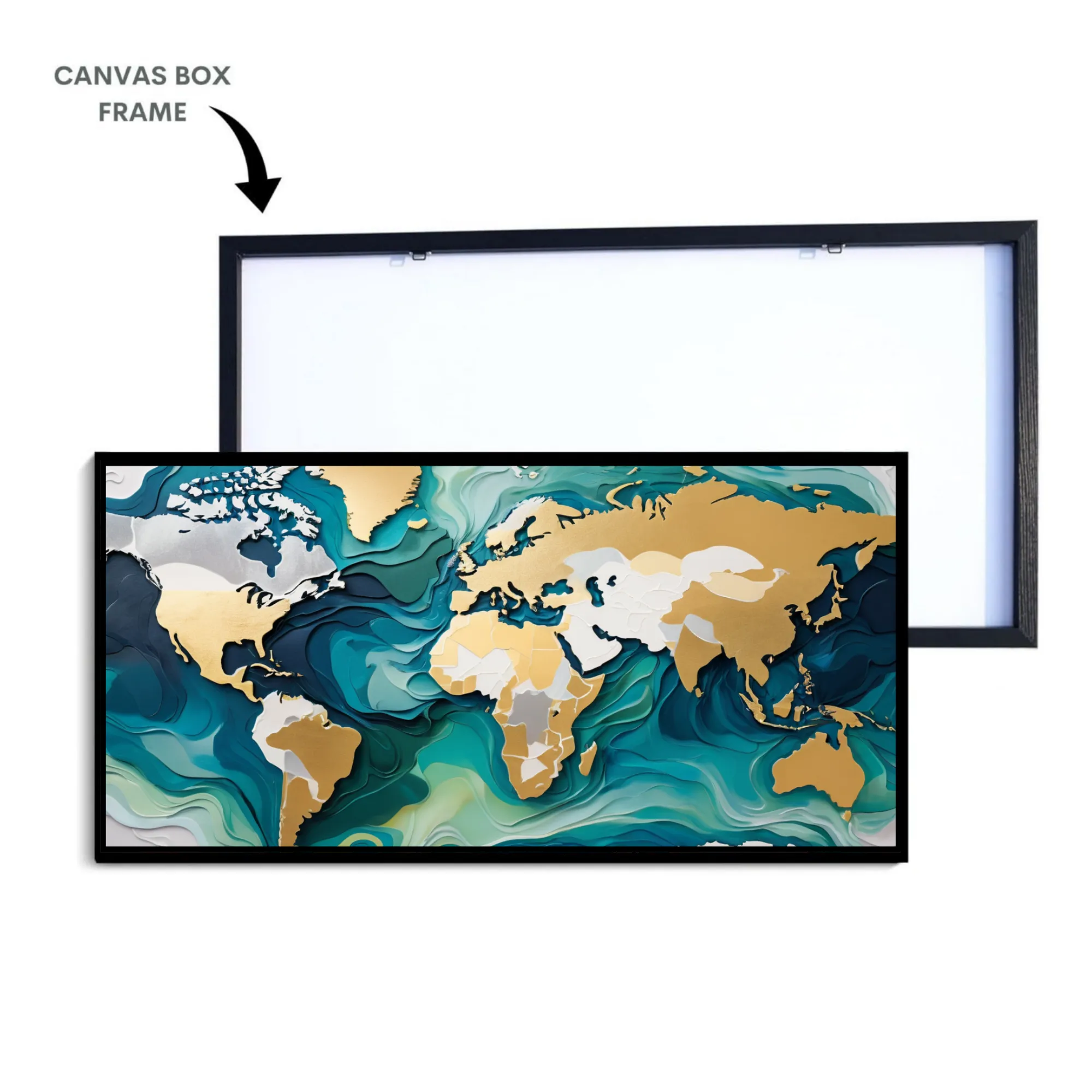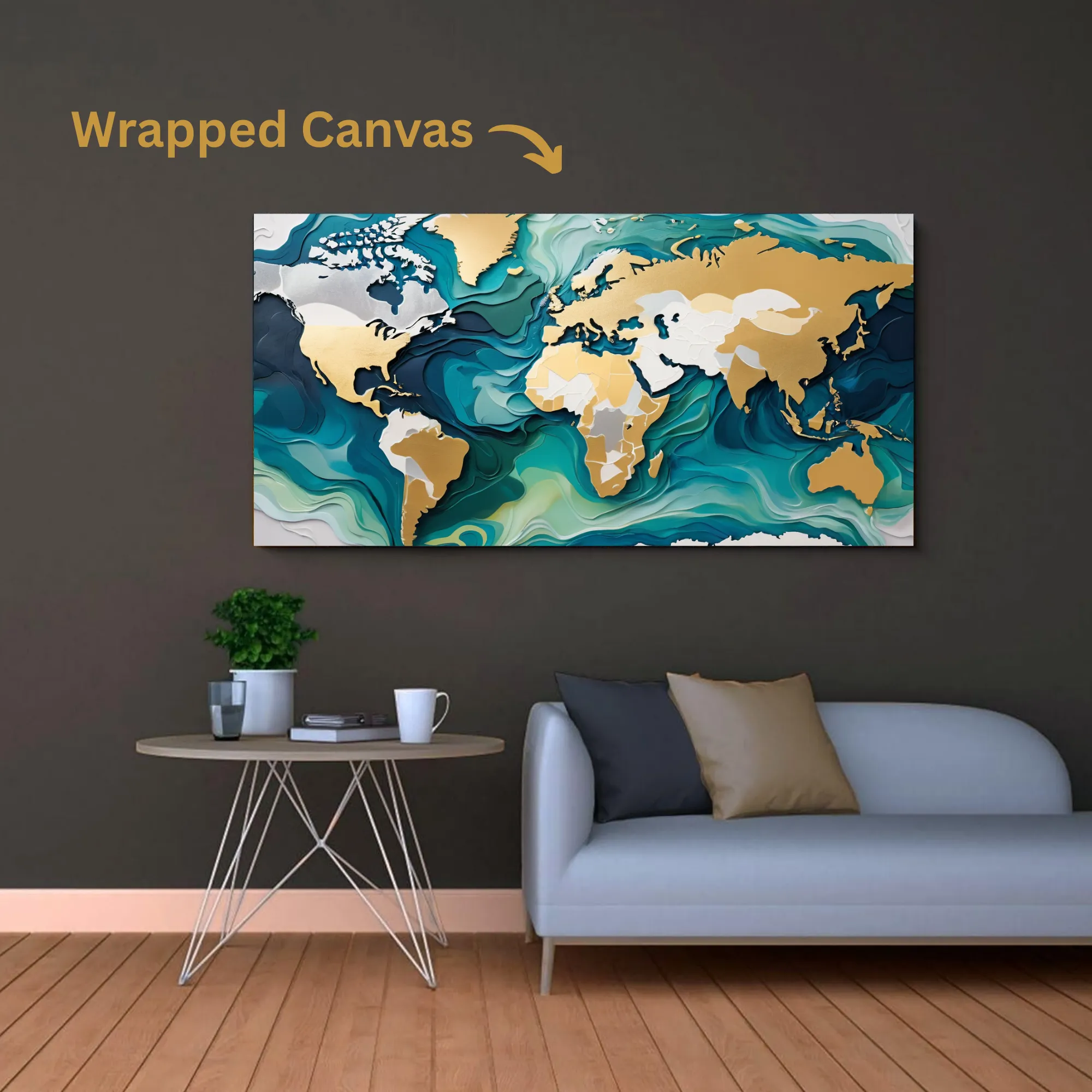 “Continental Flow” is a museum-quality cotton canvas art, crafted to bring sophistication, wanderlust, and global elegance into your space. Showcasing a modern world map with stylized continents in brushed gold and milky ivory against swirling aqua, teal, and navy waves, this artwork beautifully captures exploration and interconnectedness.
