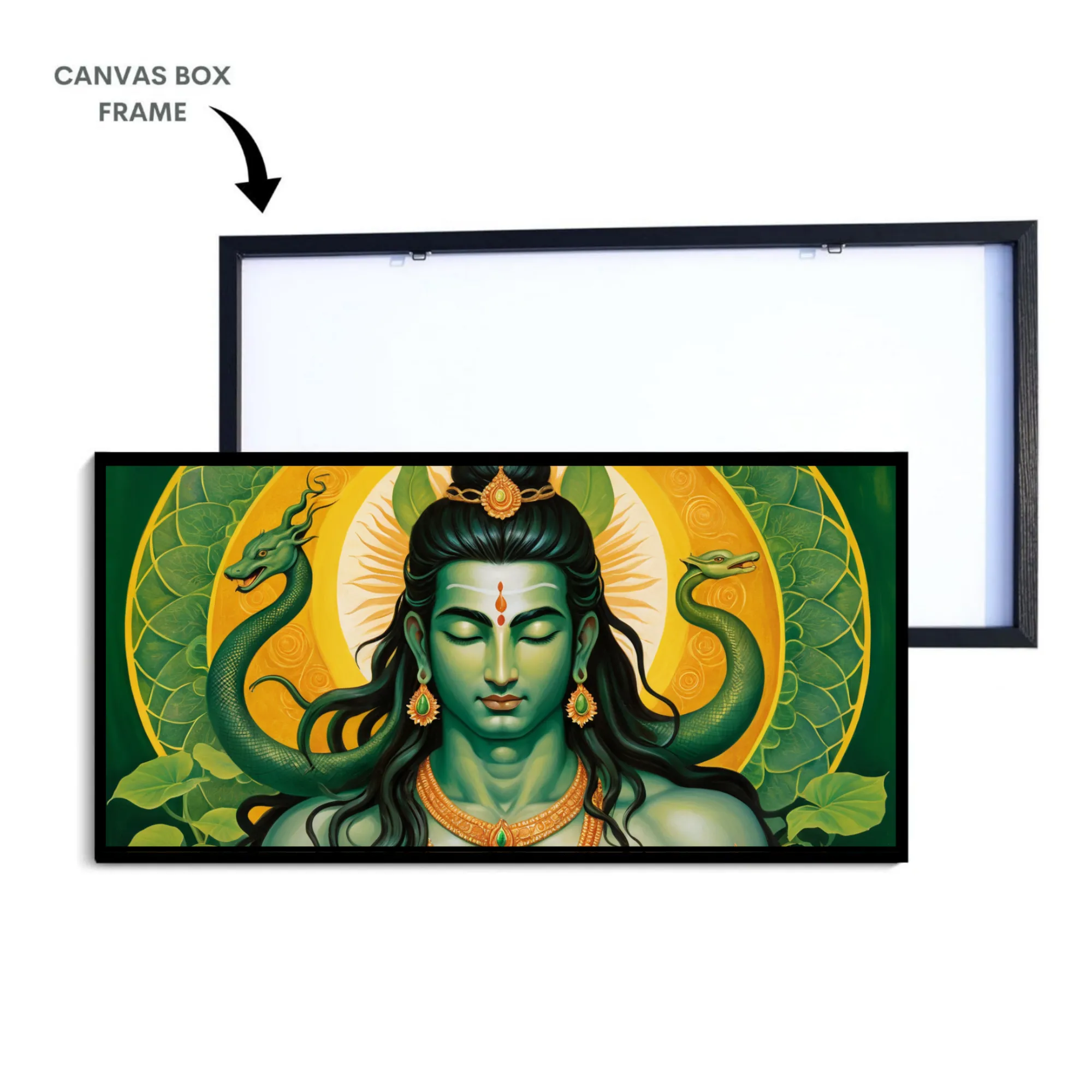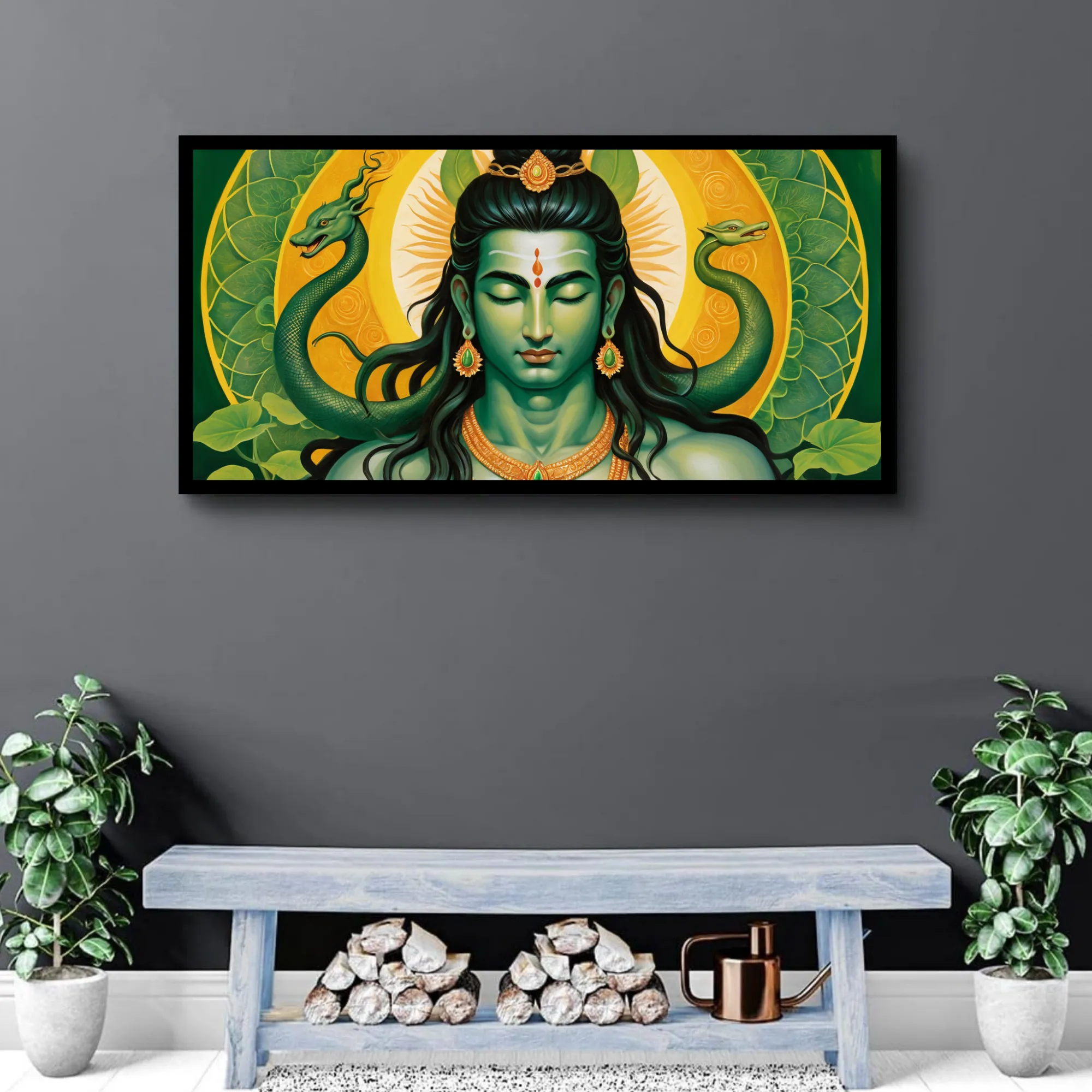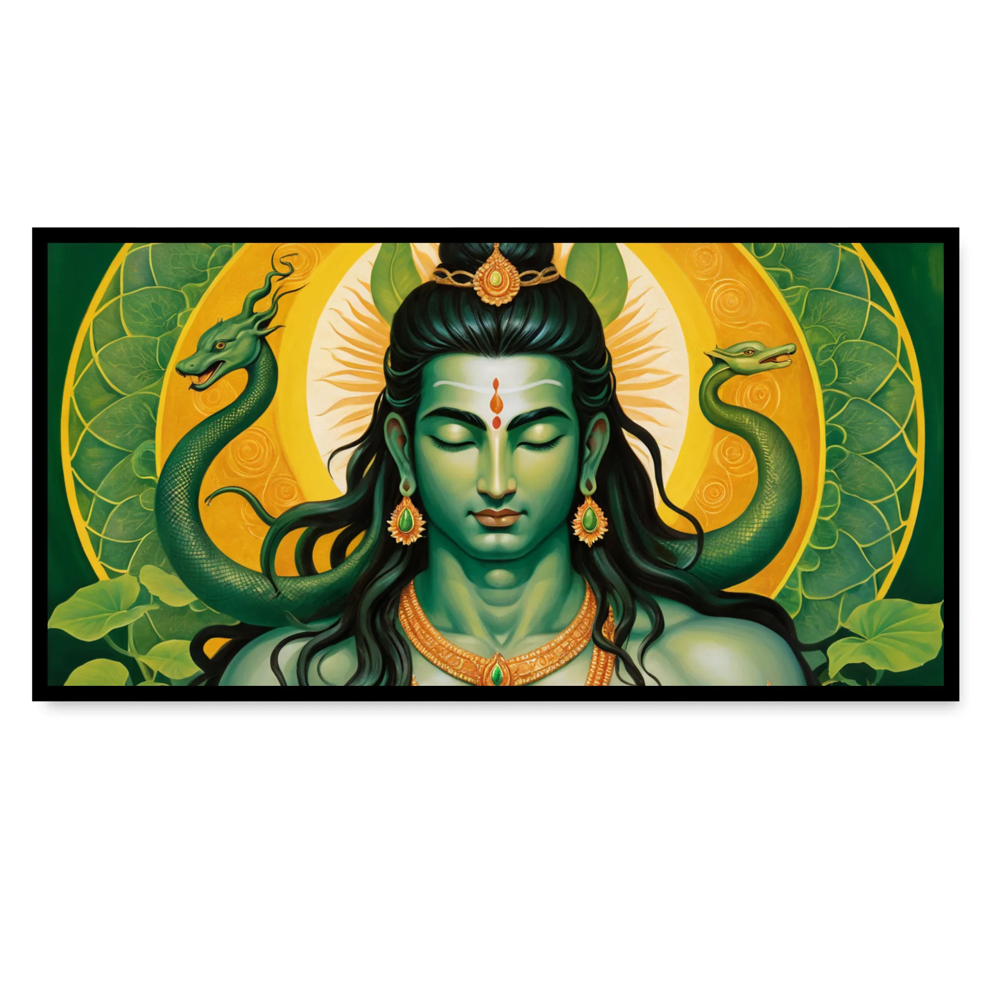 “Emerald Ascendance” is a museum-quality cotton canvas art, crafted to bring a sense of renewal, power, and unique flair into your space. Showcasing Shiva with emerald-toned serpents and a luminous yellow-green mandala, this artwork beautifully reflects the essence of transformation and vitality.