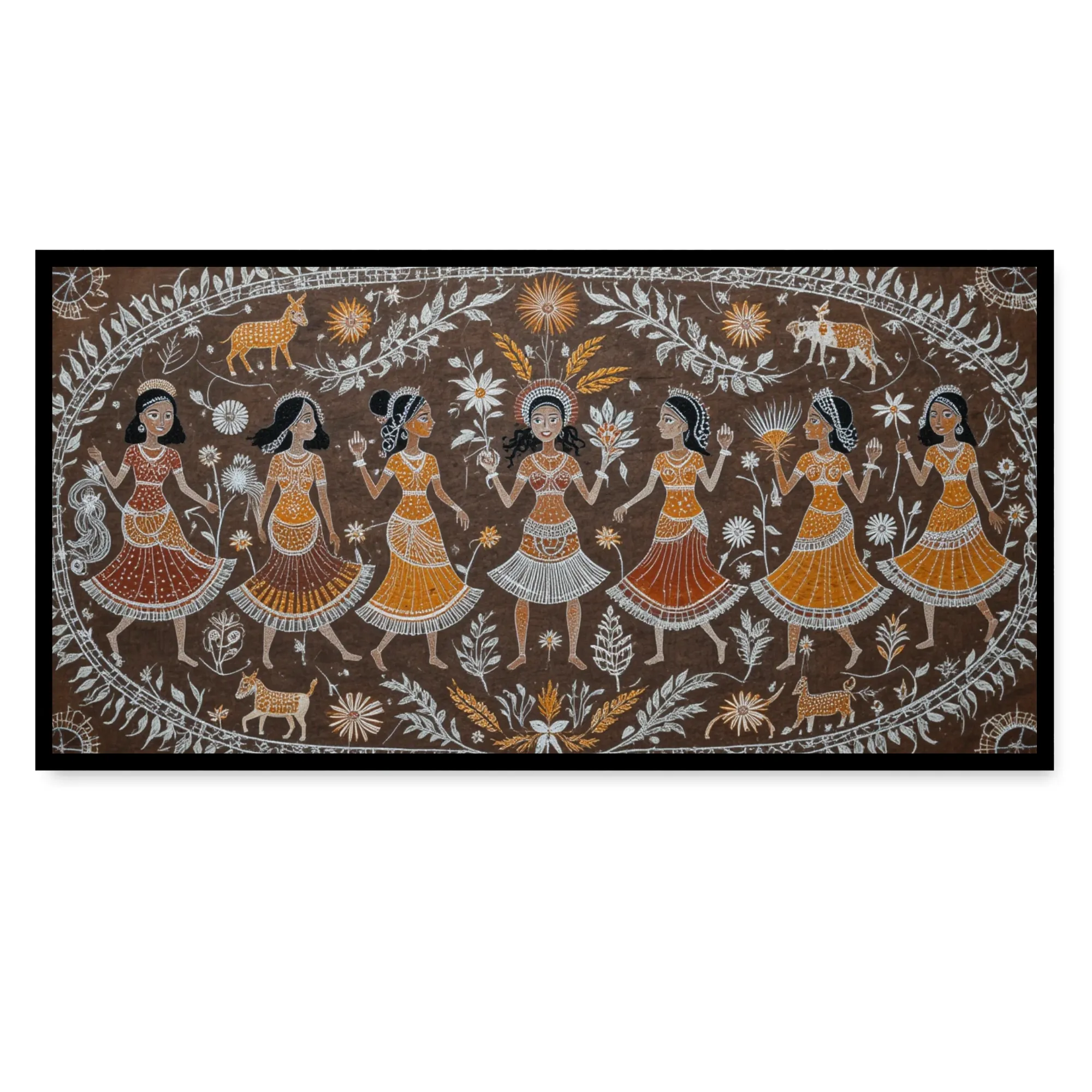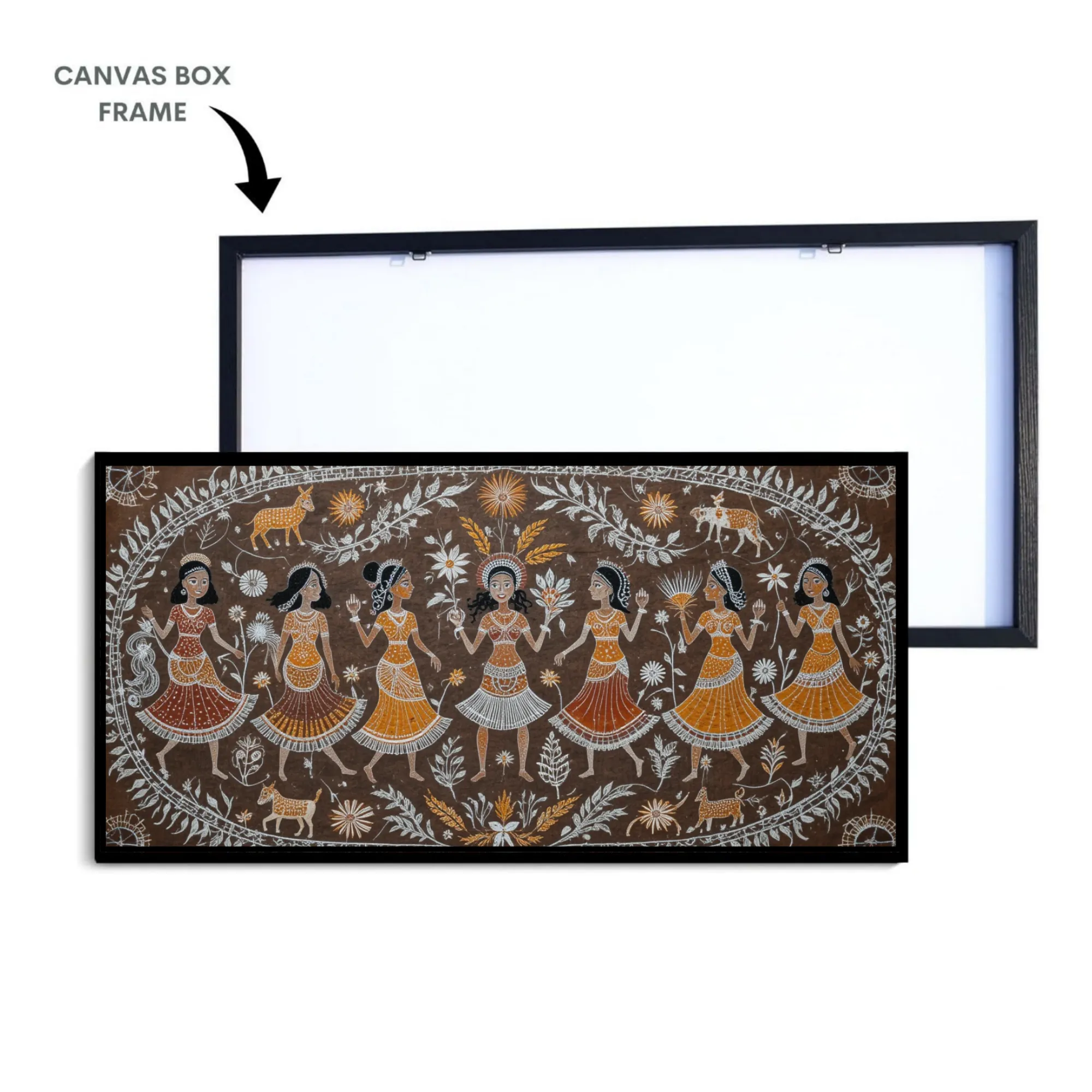 “Festive Bloom” is a museum-quality cotton canvas art, crafted to bring joy, vibrance, and a sense of celebration into your space. Showcasing elegant women in lively traditional dresses dancing under stylized trees in a circular mandala composition and surrounded by intricate folk motifs, this piece radiates Indian folk art charm and unity.