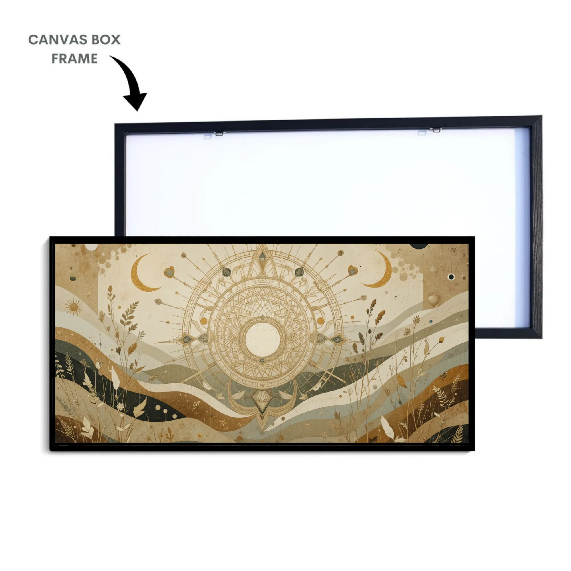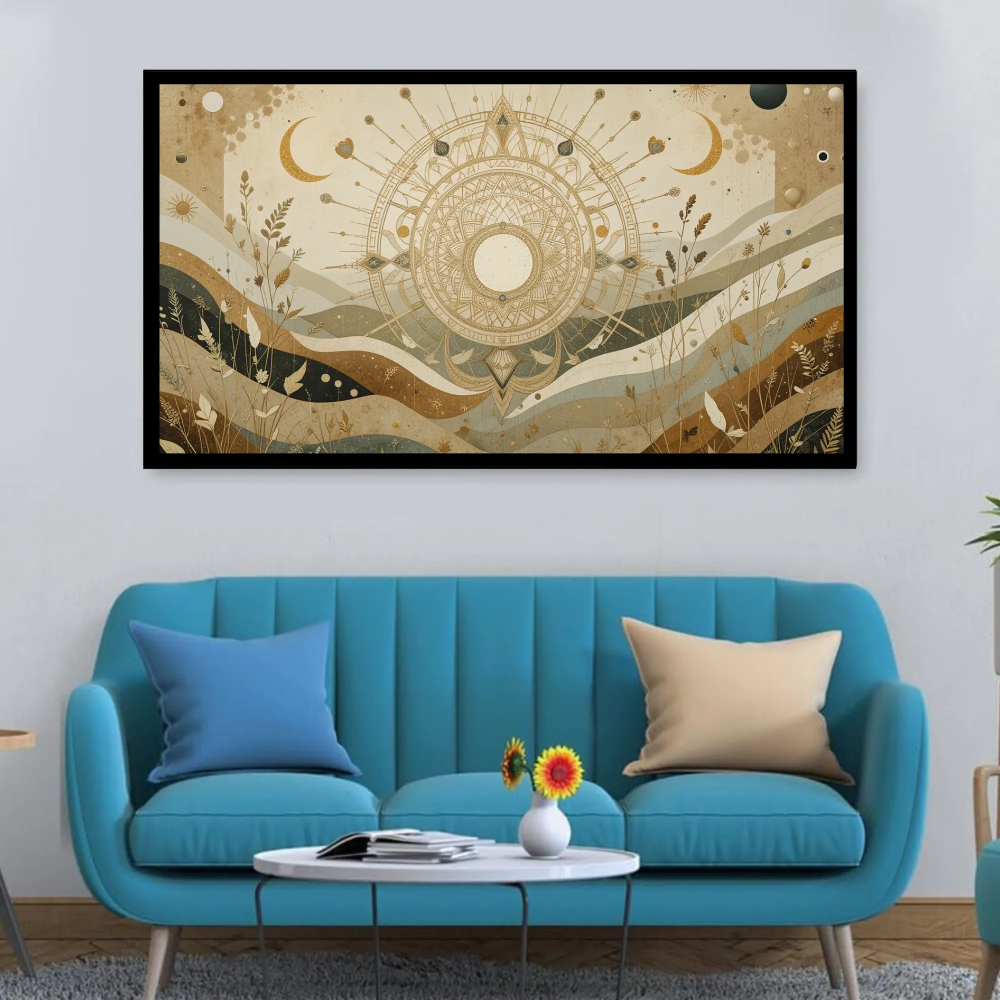 Fields of Celesta is a museum-quality cotton canvas painting, crafted to bring serenity, creativity, and inspiration into your space. Featuring a radiant mandala sun surrounded by crescent moons and botanical details in harmonious beige, gold, and teal tones, this artwork evokes nature’s wisdom and celestial wonder.