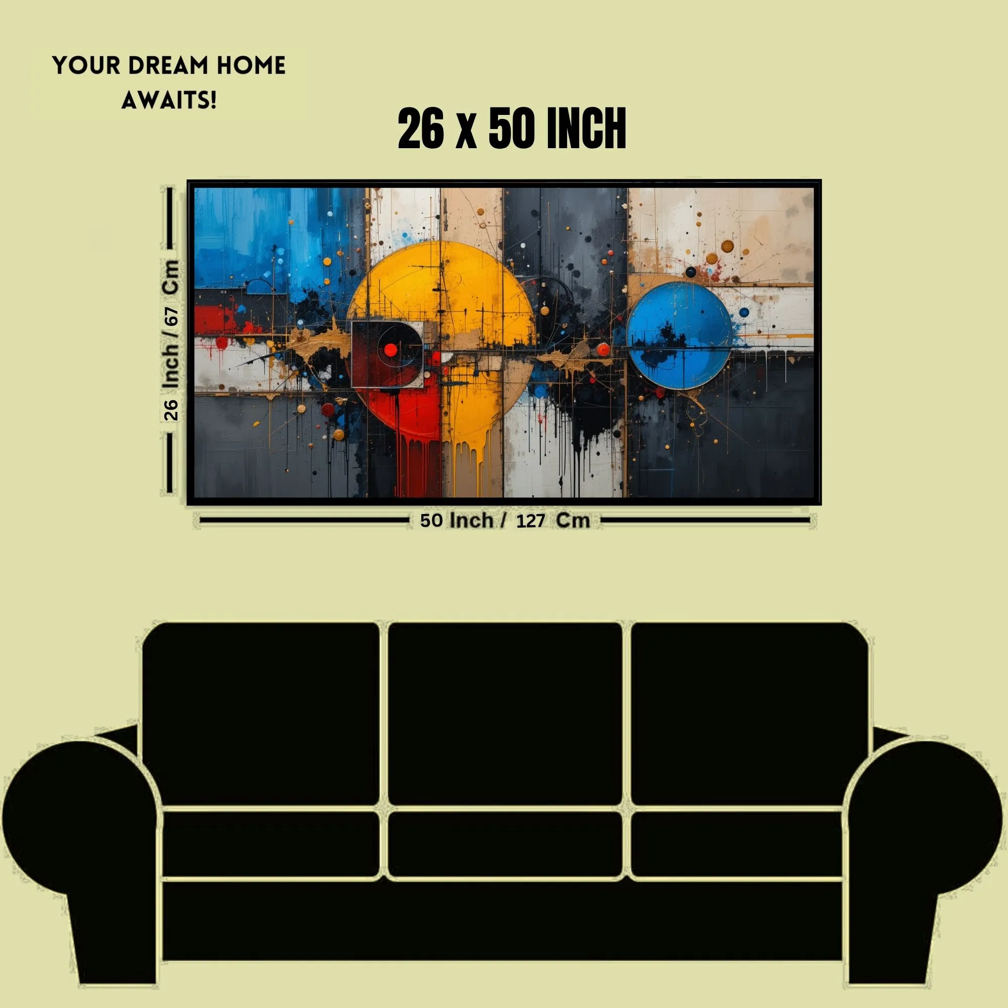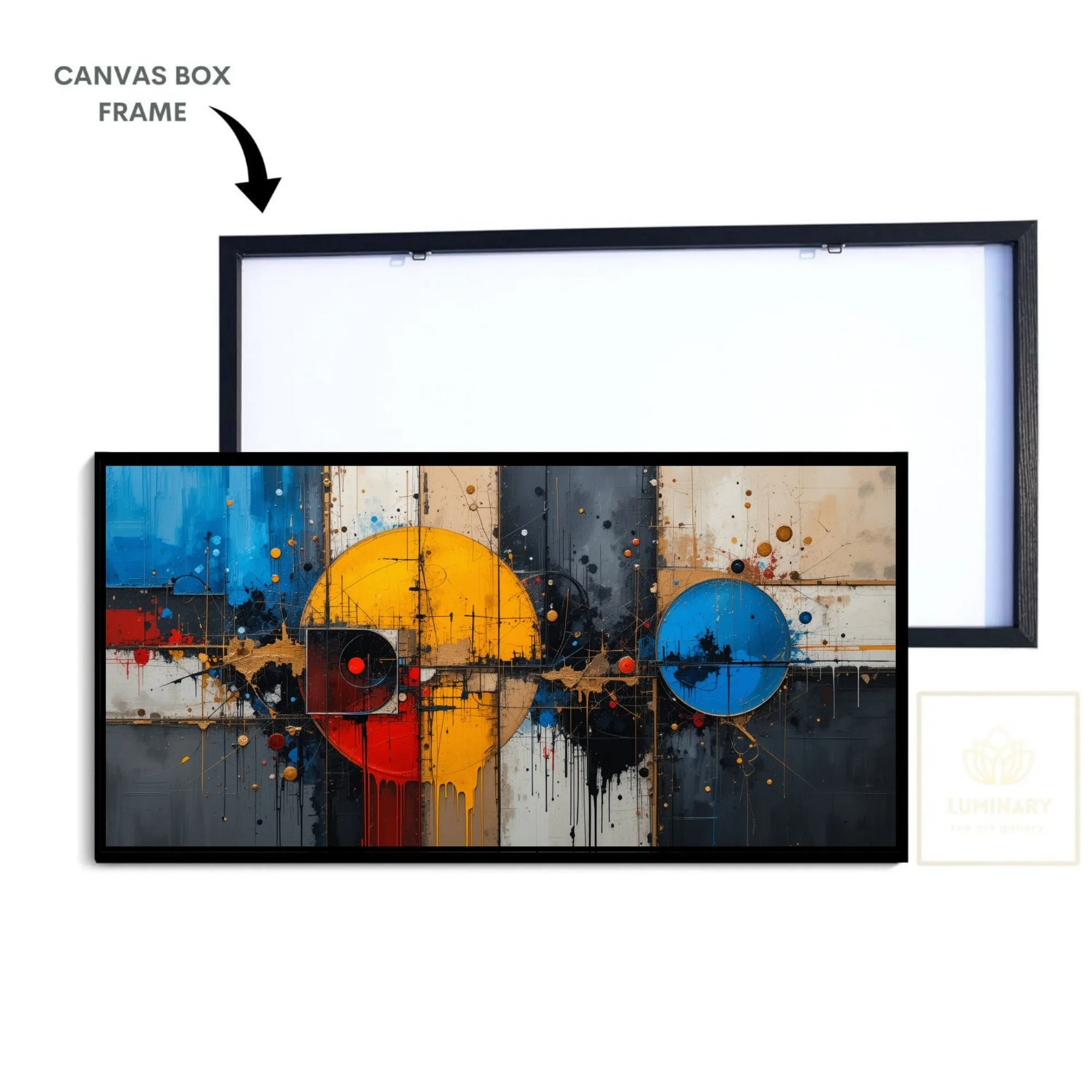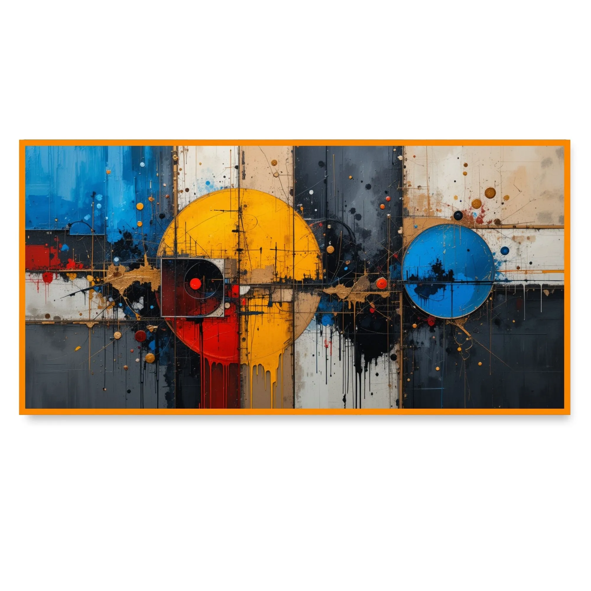 This striking abstract painting captures the harmony of geometry and chaos through a dynamic interplay of circles, lines, and vibrant color fields. Dominated by bold primary tones of yellow, red, and blue, balanced against deep blacks, greys, and whites, the artwork symbolizes the eternal tension between order and spontaneity. The central golden circle radiates warmth and energy, while the blue orb conveys depth, calmness, and cosmic vastness. Drips, splatters, and textured layers introduce a sense of raw movement, suggesting the unpredictability of life and the universe. The precise geometric framework contrasts beautifully with the expressive paint strokes, making this piece both architectural and emotional—a celebration of balance, contrast, and infinite possibilities.