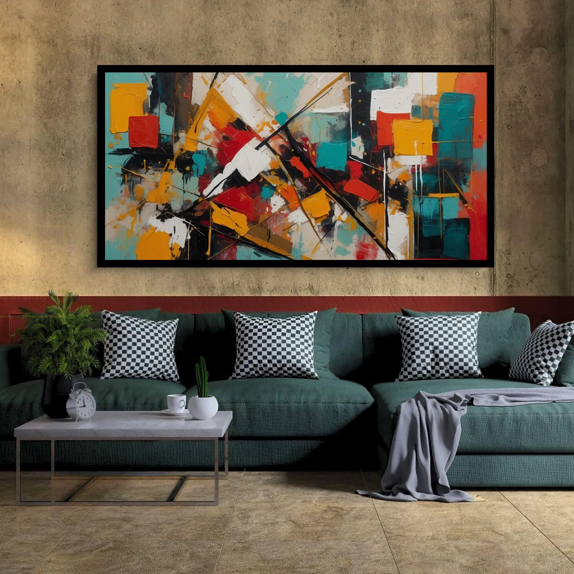 Perfect for living rooms, studios, or entertainment spaces, “Geometric Pulse” elevates interiors with museum-quality richness, durability, and urban chic décor.
