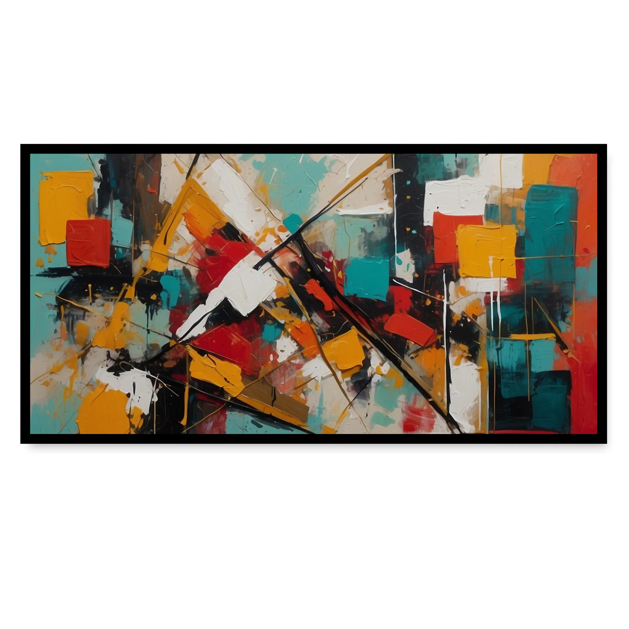 “Geometric Pulse” is a museum-quality cotton canvas art, crafted to bring vibrance, energy, and a modern edge into your space. Showcasing bold geometric blocks and shards in turquoise, saffron, crimson, white, and black, this artwork brilliantly reflects urban dynamism and structured rhythm.