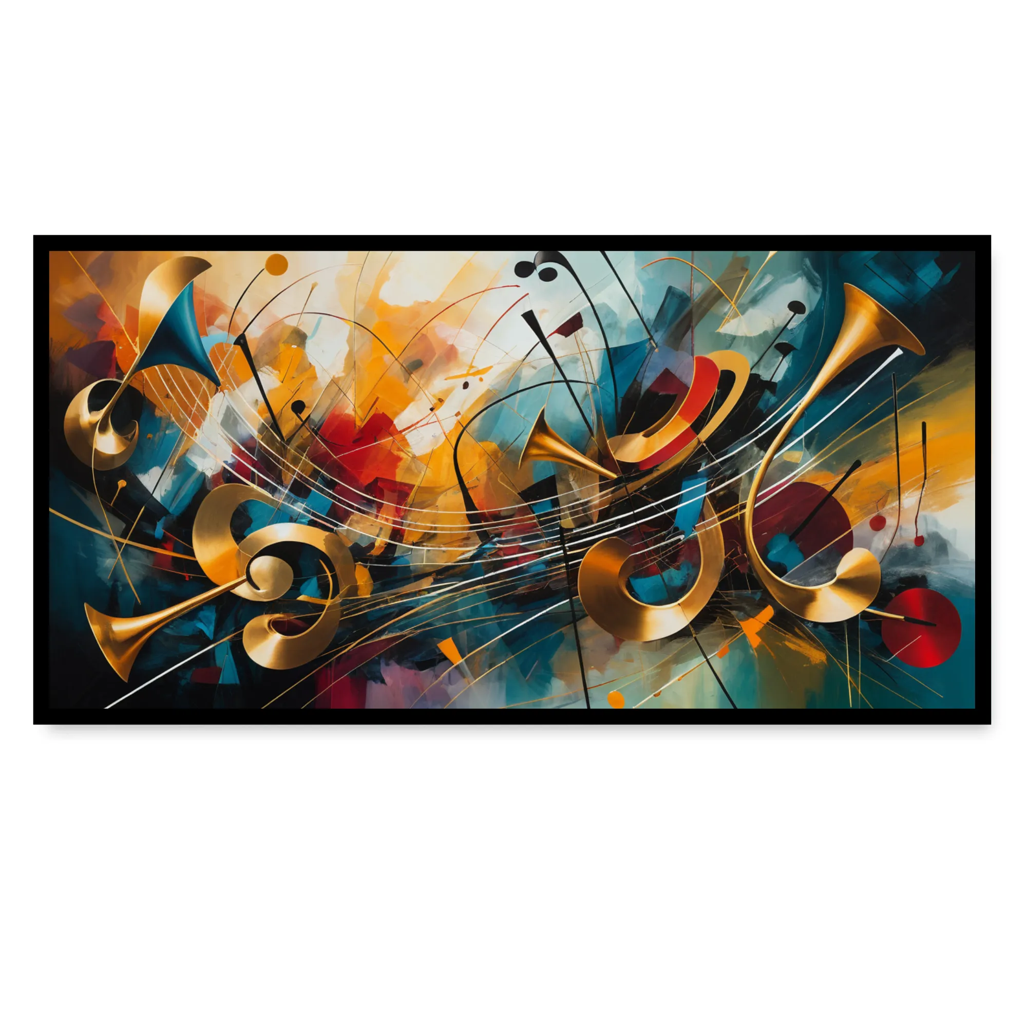 Golden Crescendo is a museum-quality cotton canvas art, crafted to bring drama, vibrance, and a sense of movement into your space. Featuring swirling golden brass instruments set against energetic strokes of red, teal, gold, and indigo, this artwork embodies the boldness and fluidity of musical creation.