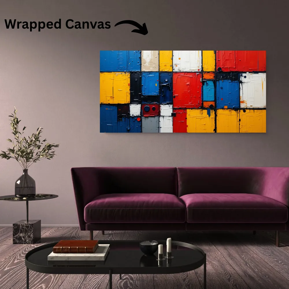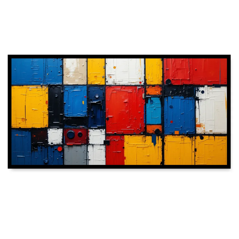 This bold and vibrant artwork is a striking exploration of geometry, color, and texture. Composed of a series of rectangular blocks in primary hues of red, blue, and yellow, balanced with black, white, and neutral tones, the piece reflects a modernist influence while adding depth through its richly textured surface. The use of thick, layered brushstrokes creates a tactile quality, giving the structured composition a sense of movement and energy. Small circular accents disrupt the rigidity of the grid, introducing a playful rhythm that contrasts with the otherwise orderly arrangement. This painting embodies the harmony between structure and spontaneity, offering viewers a dynamic visual experience that is both architectural and expressive.