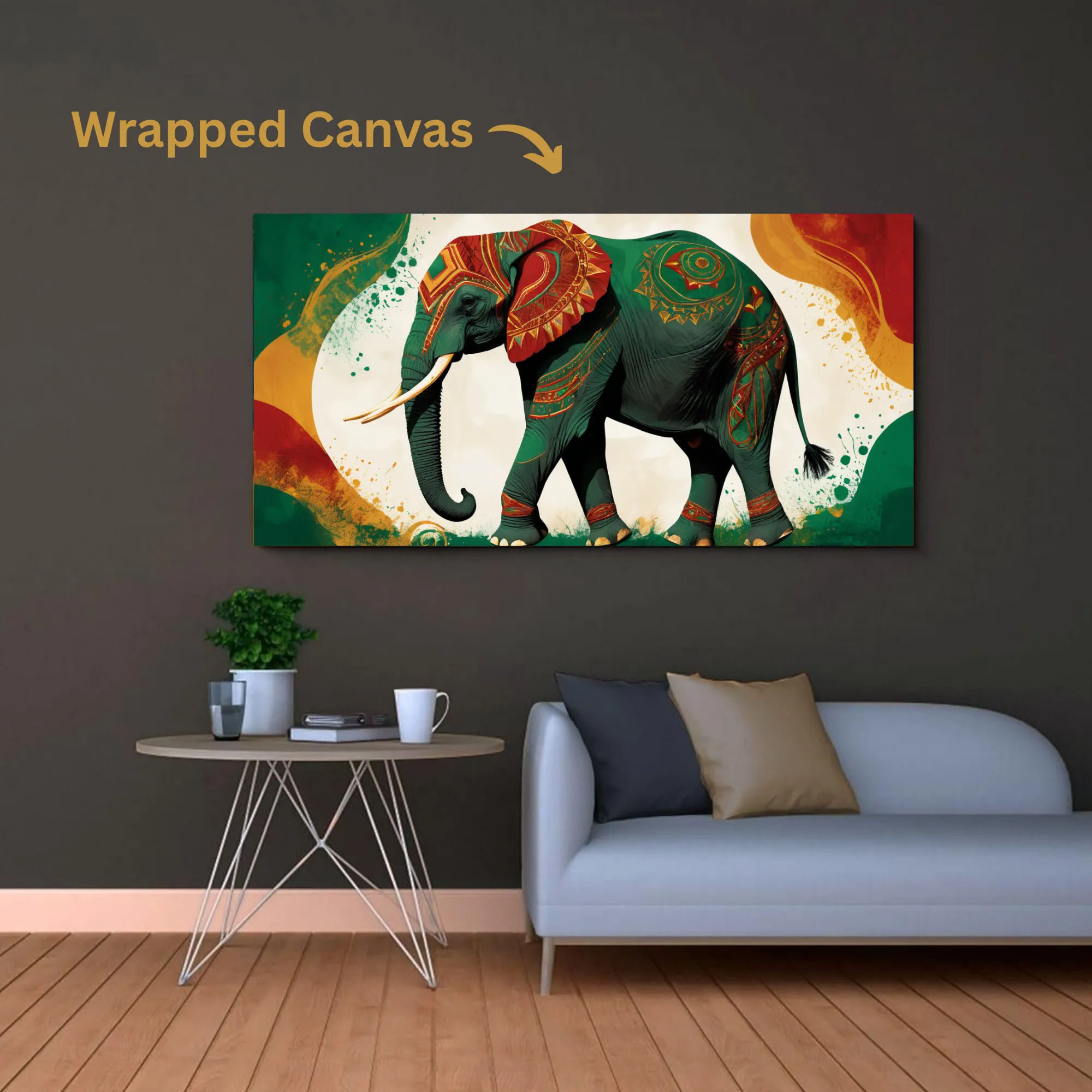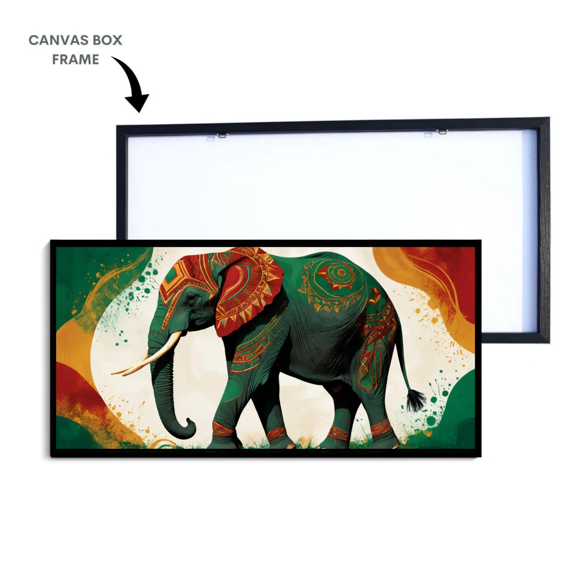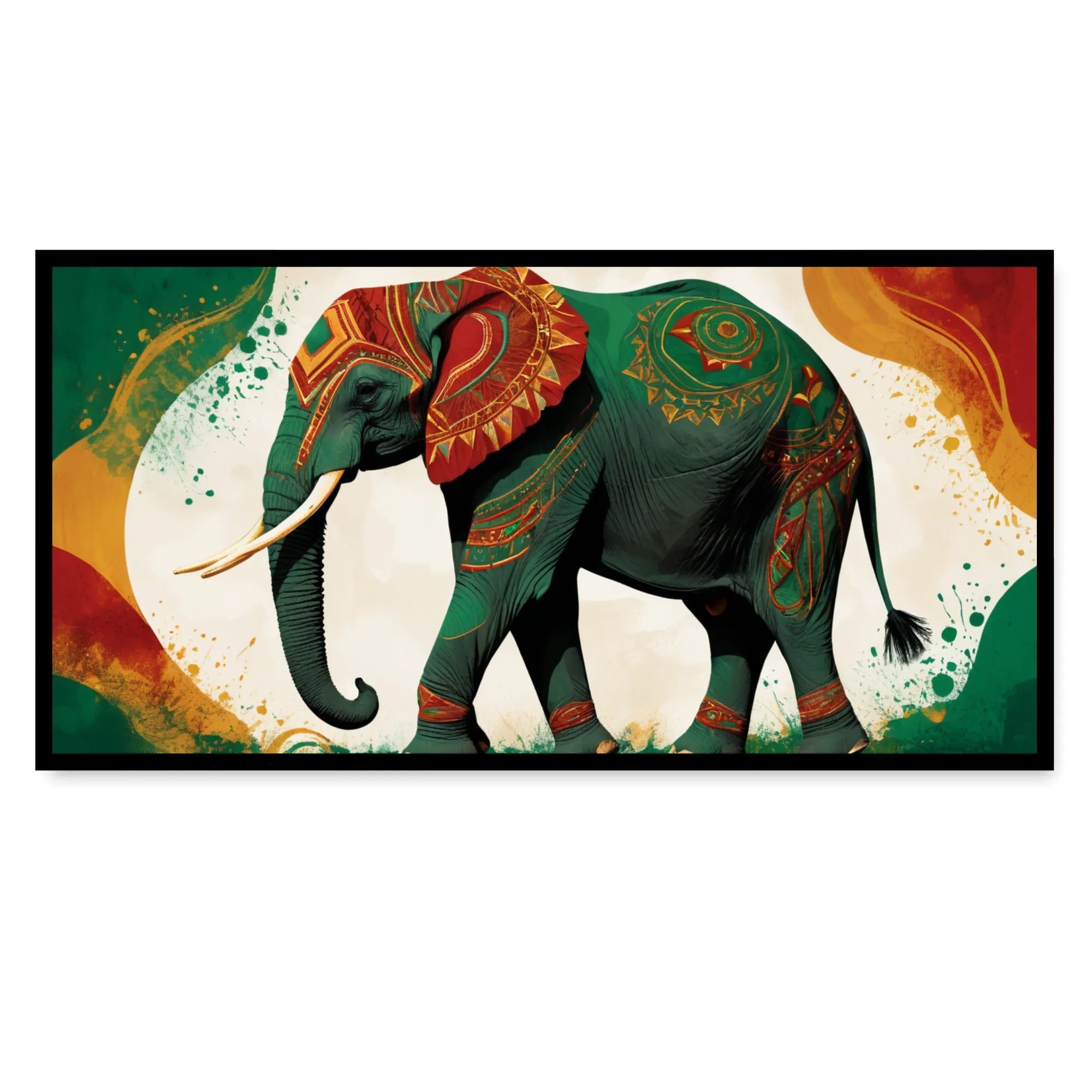 The dynamic abstract backdrop and intricate patterns add a contemporary flair, symbolizing flow of energy, transformation, and cultural celebration. More than just wall décor, this premium cotton canvas print carries the timeless meaning of the elephant—wisdom, strength, and good fortune—making it a symbolic centerpiece for any room.