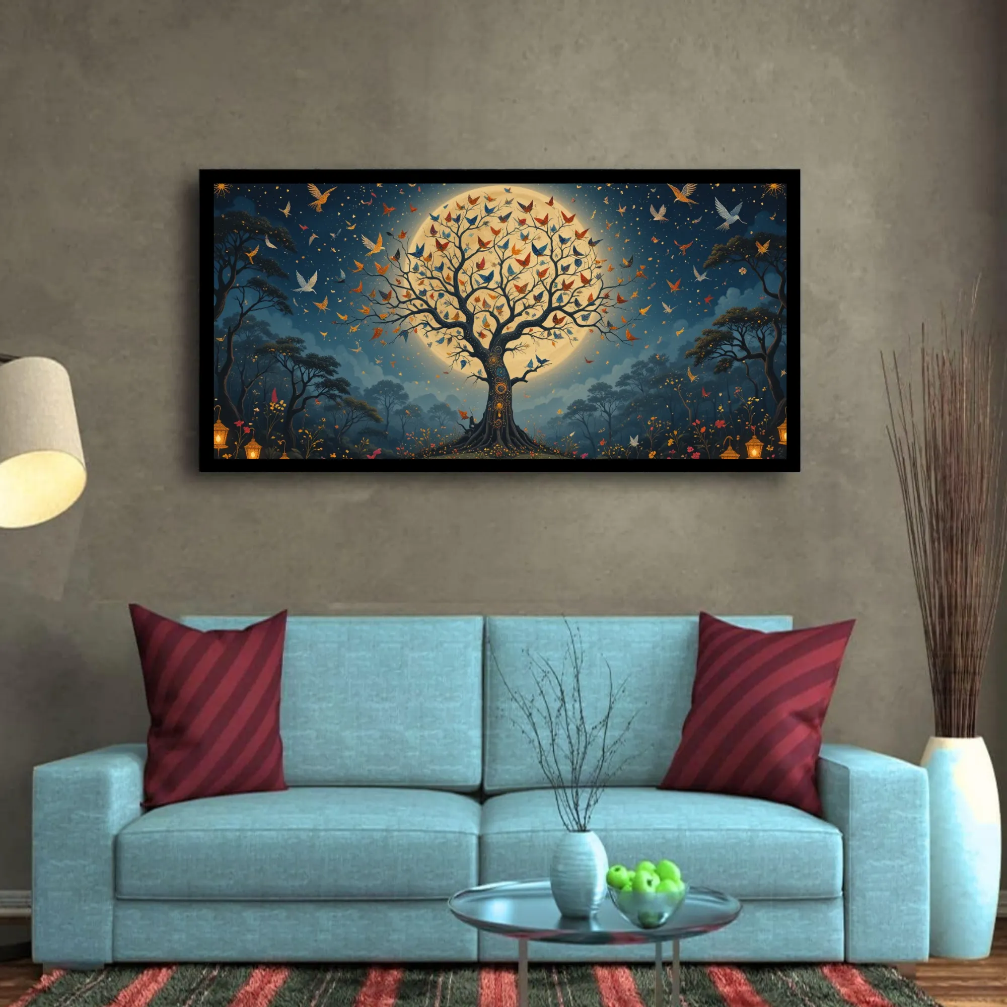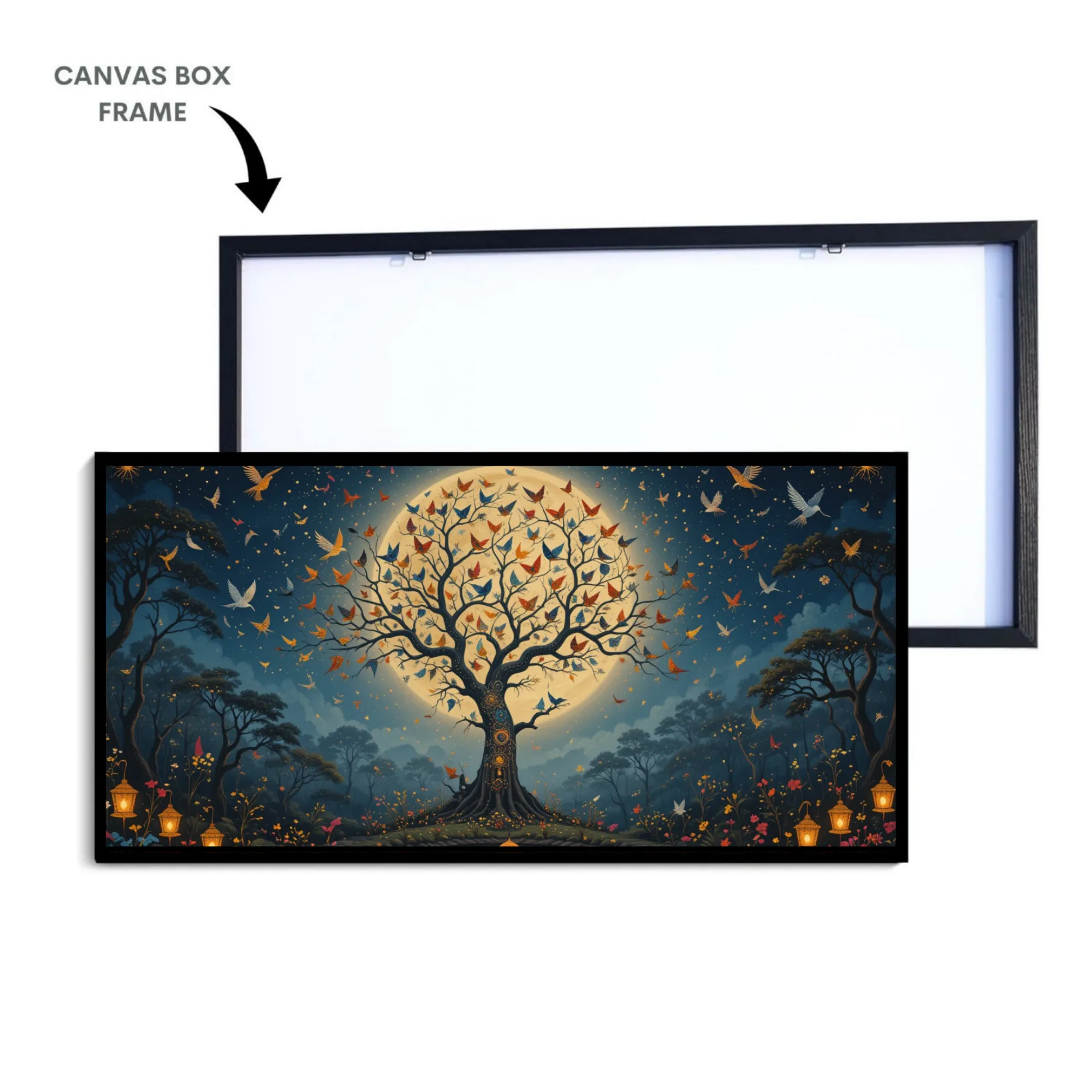 Moonlit Migration is a museum-quality cotton canvas art, crafted to bring awe, vibrance, and a sense of magical movement into your space. Showcasing a majestic tree beneath an enormous glowing moon, surrounded by vibrant birds in flight and warm lanterns glowing among the forest, this artwork celebrates freedom and dreams in shades of midnight blue, gold, and fiery orange.