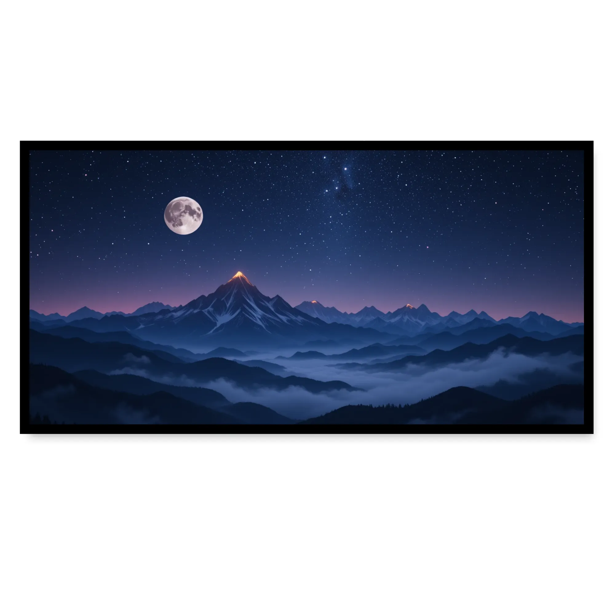This mesmerizing artwork captures the serene beauty of a moonlit mountain landscape under a star-filled sky. The majestic peaks, softly illuminated by a gentle glow, rise above layers of misty valleys, creating a sense of depth and tranquility. The full moon radiates calm energy, while the scattered stars enhance the dreamlike atmosphere, making the scene feel both peaceful and awe-inspiring. With its deep blues, purples, and subtle highlights, this artwork embodies the quiet power of nature and the stillness of night, making it a perfect piece for creating a calming and reflective ambiance in any room.