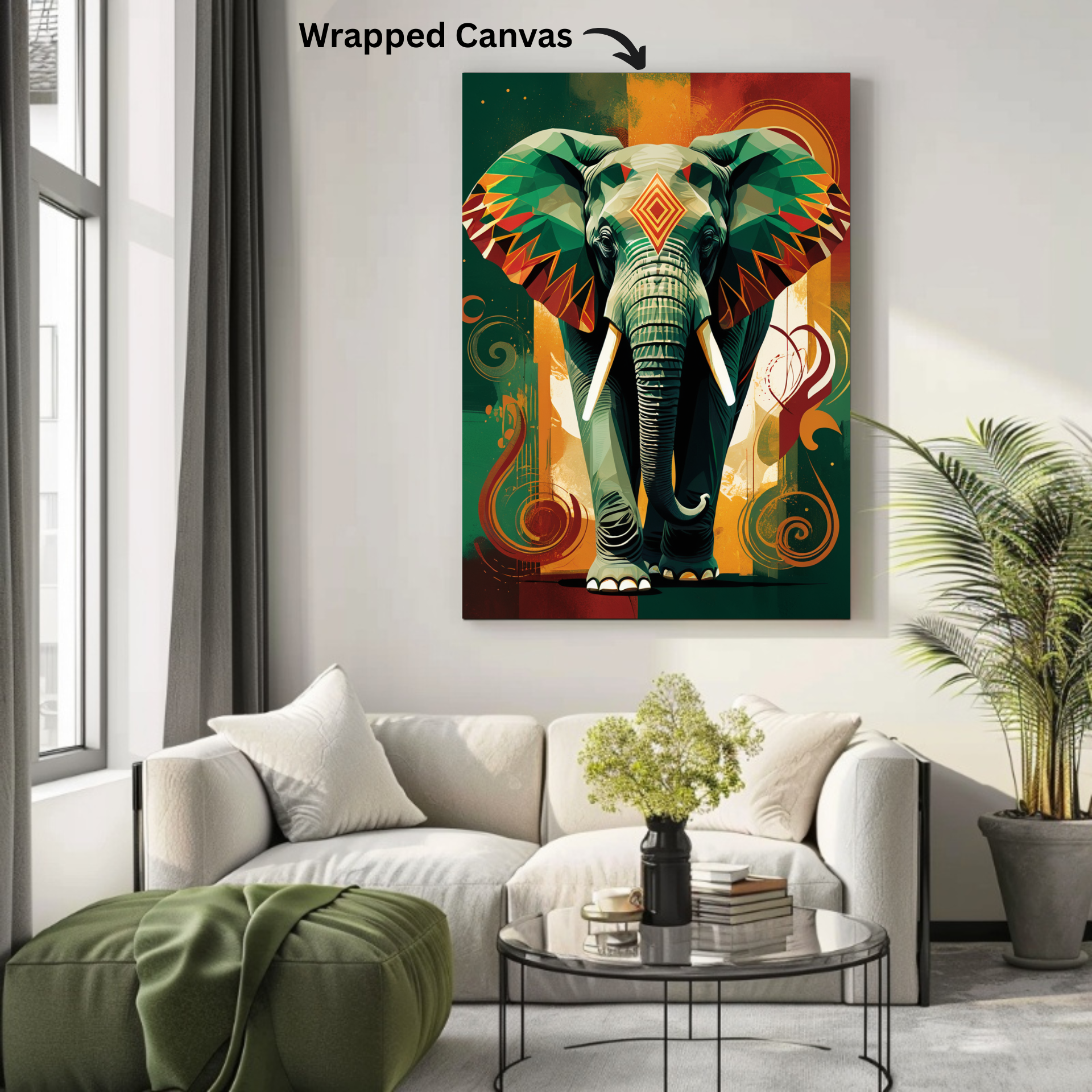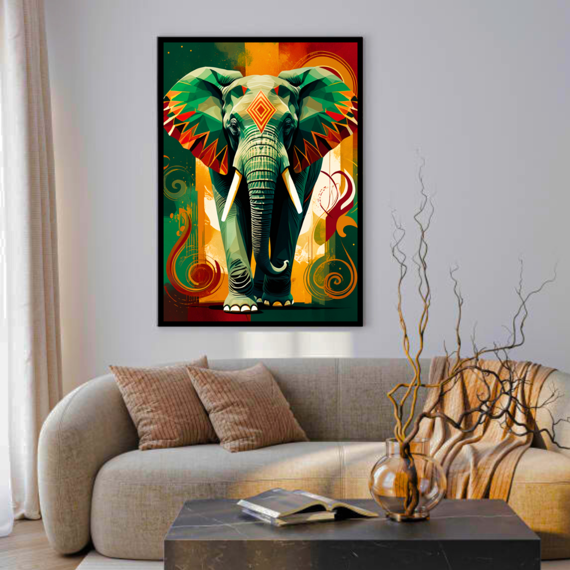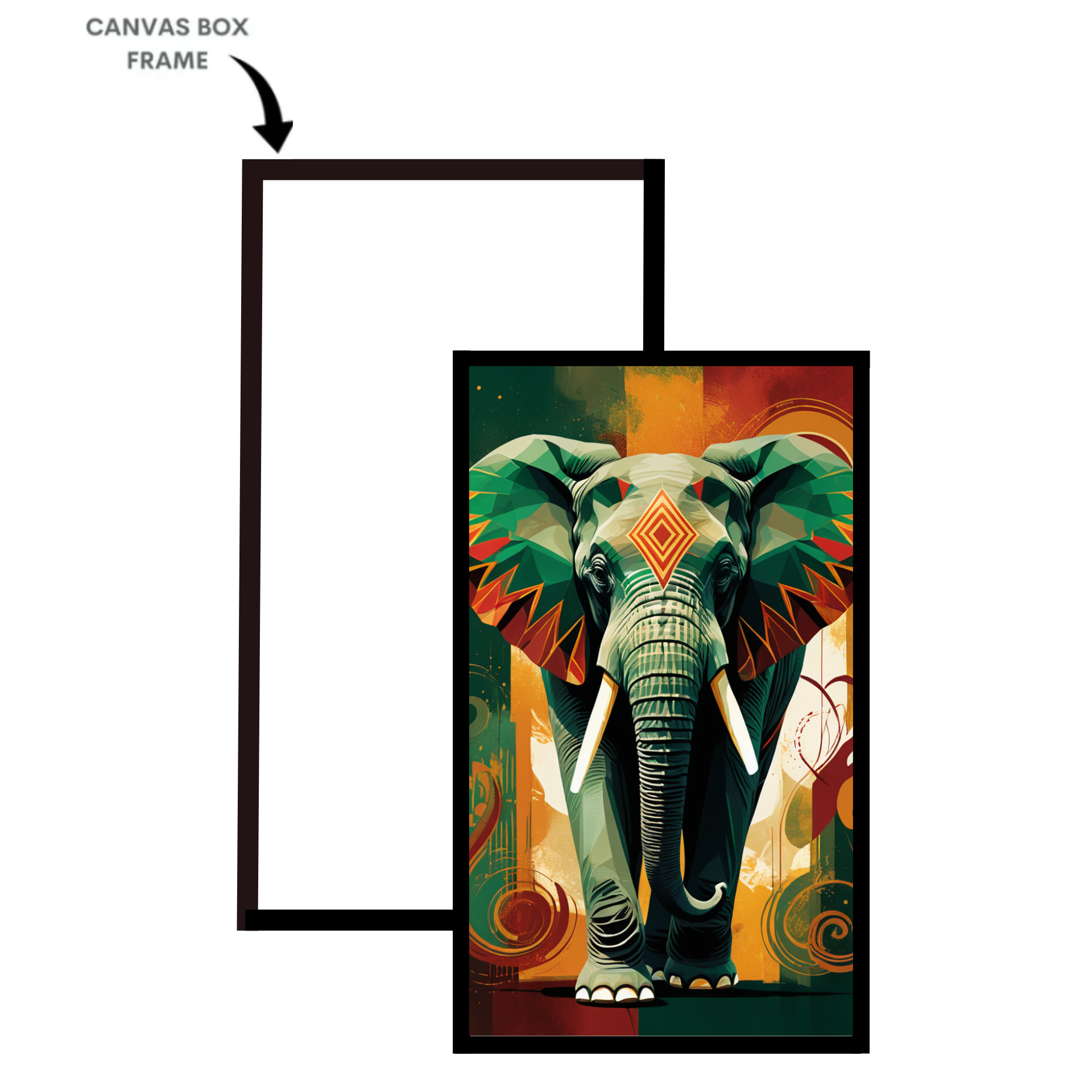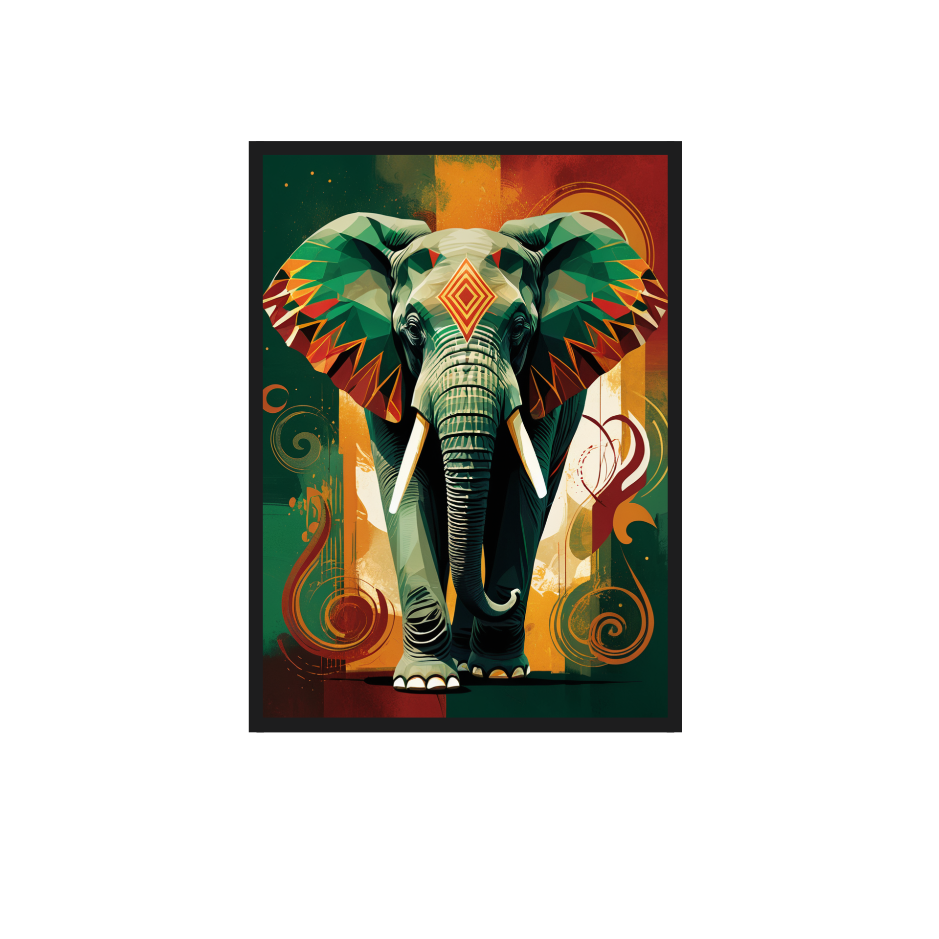 “Regal Rhythm – Geometric Elephant Majesty” is a museum-quality cotton canvas art, crafted to bring strength, vibrance, and personality into your space. Showcasing a majestic elephant rendered in bold geometric facets and tribal-inspired patterns in rich shades of emerald green, amber, ochre, and deep teal, this artwork beautifully reflects the essence of power, protection, and modern elegance Décor.