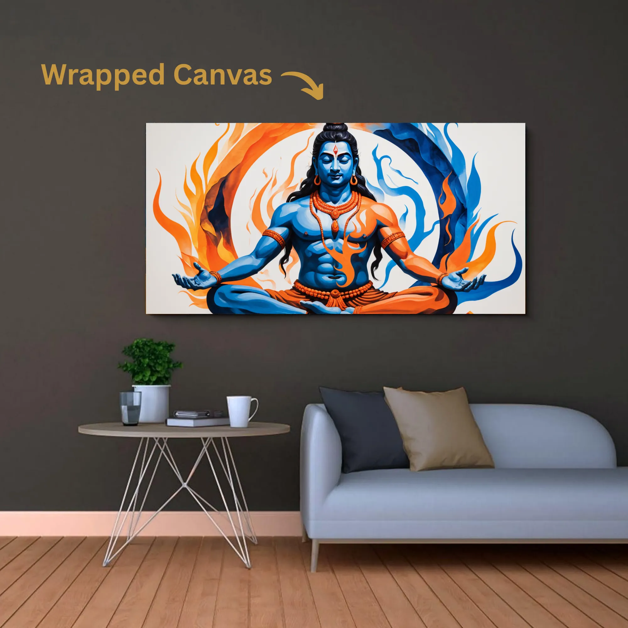 The swirling flames around Shiva add a vivid contemporary touch, symbolizing the interplay of creation and destruction, warmth and coolness. More than just wall décor, this premium canvas print highlights Shiva as the eternal source of elemental balance, elevating any interior.