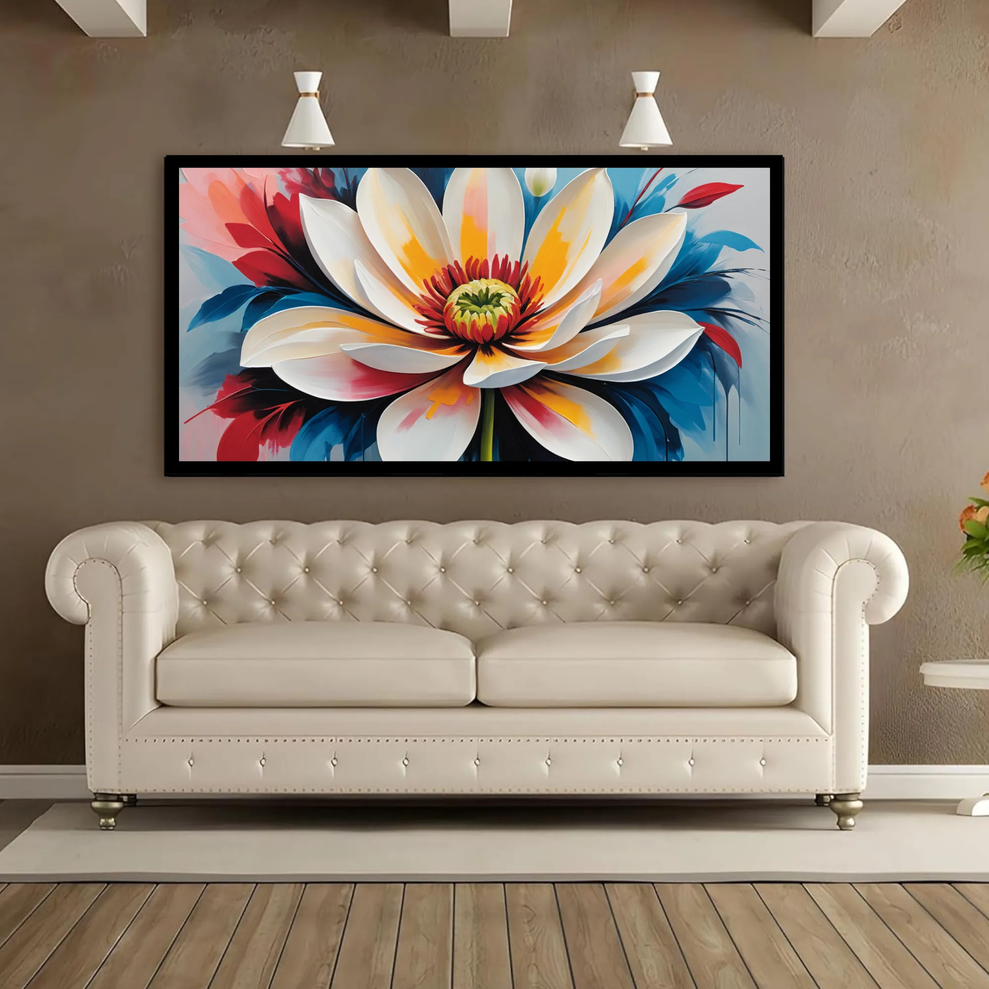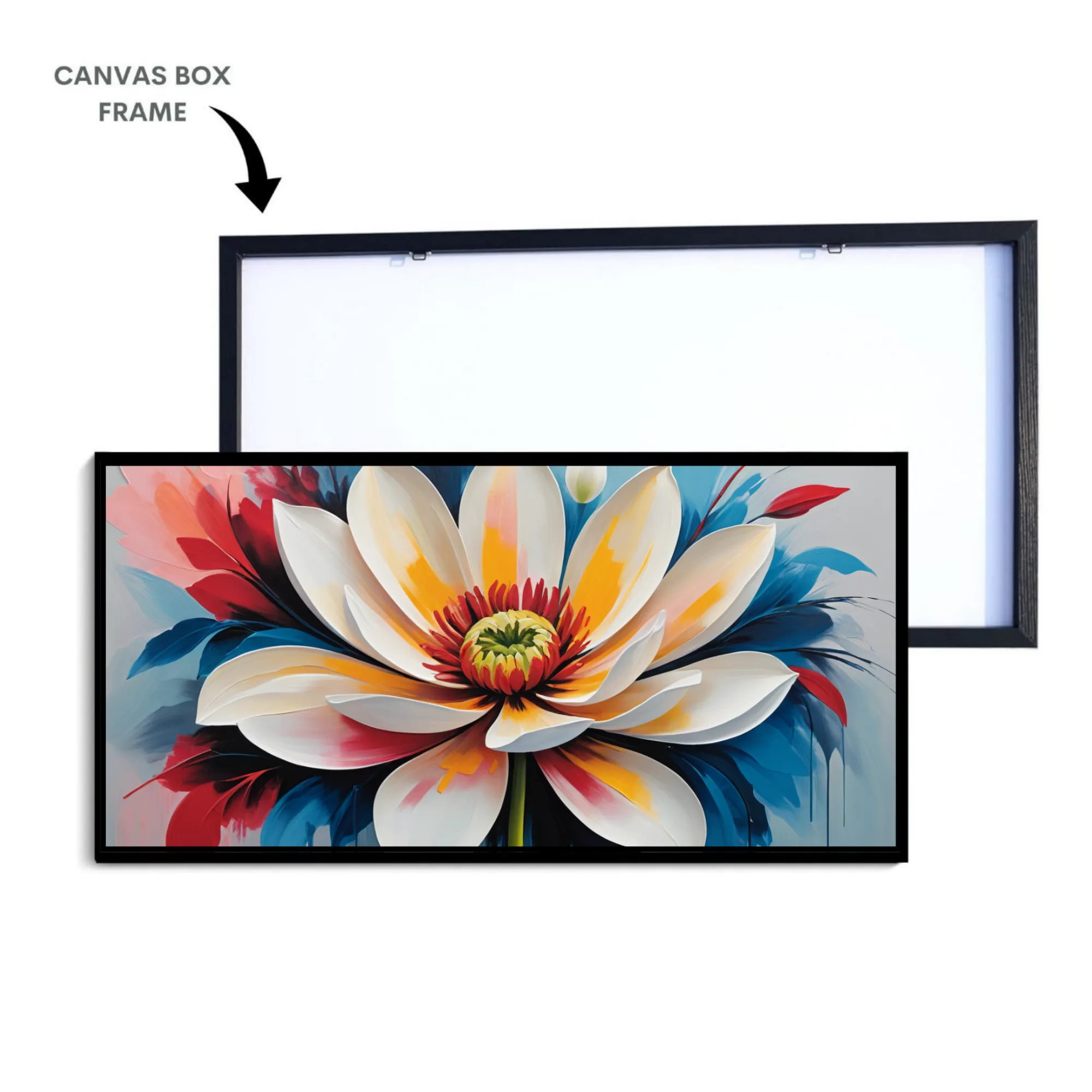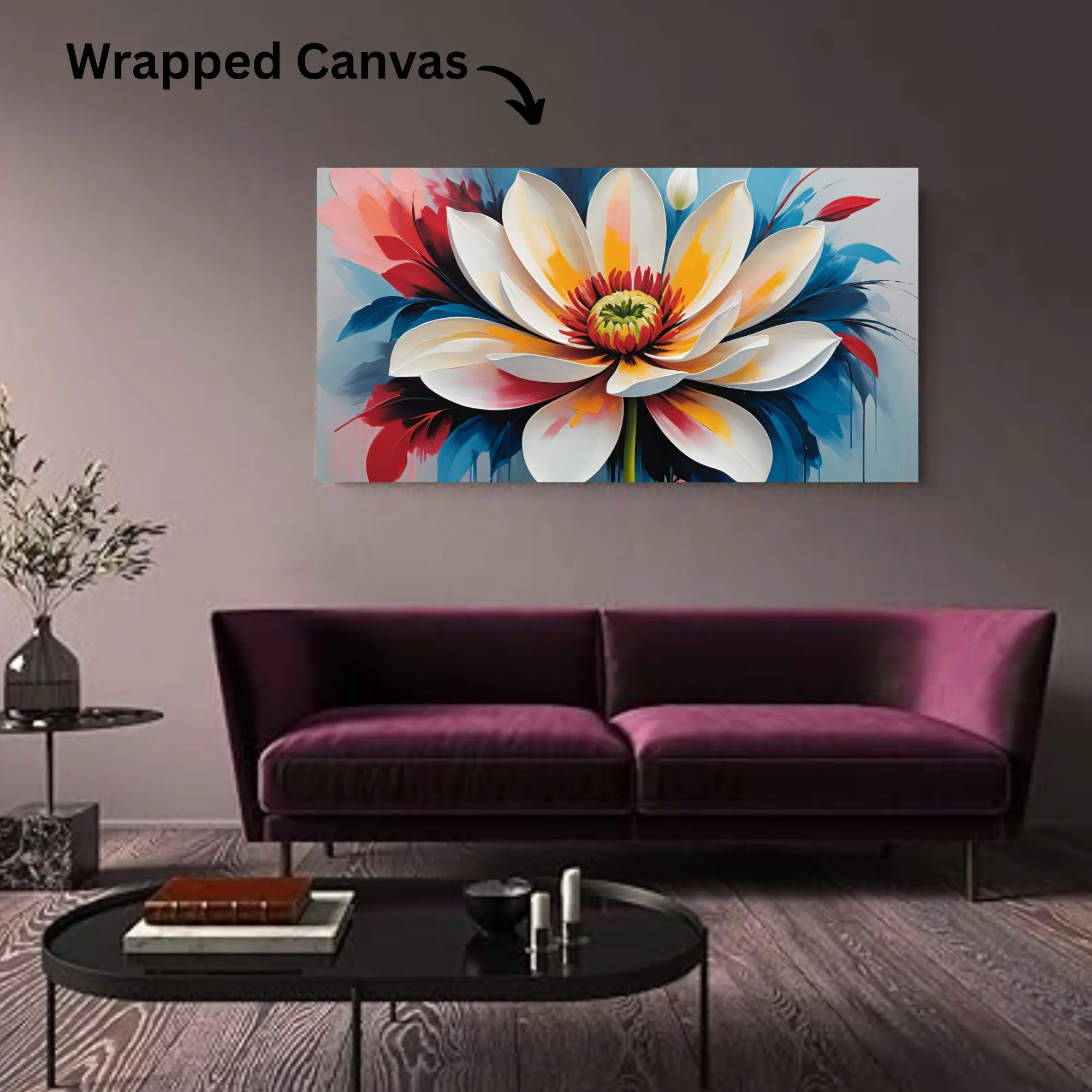 Sunburst Lotus Symphony is a premium cotton canvas print, designed to infuse vibrance, style, and a burst of positive energy into your home. Showcasing a lively lotus in shades of ivory, yellow, and coral, highlighted by bold blue and red accents, this masterpiece echoes the themes of celebration and dynamic elegance.