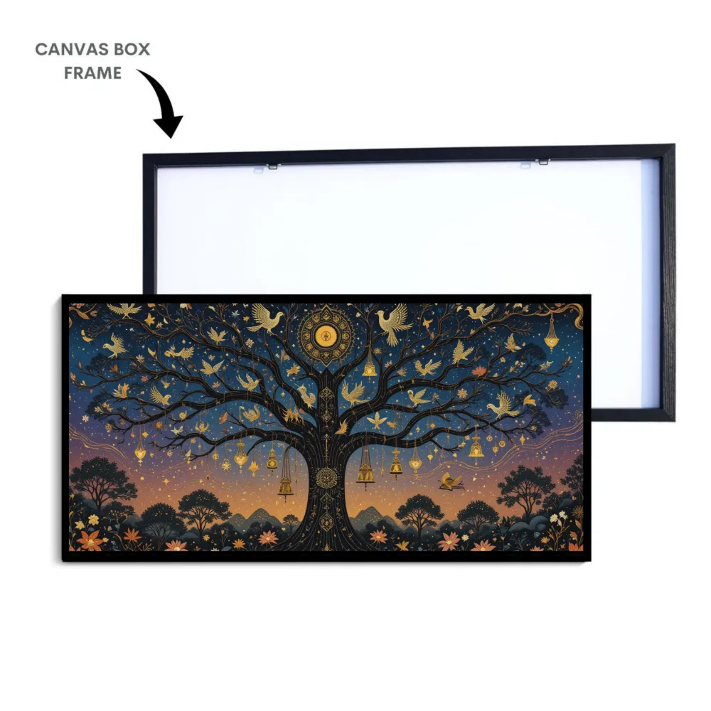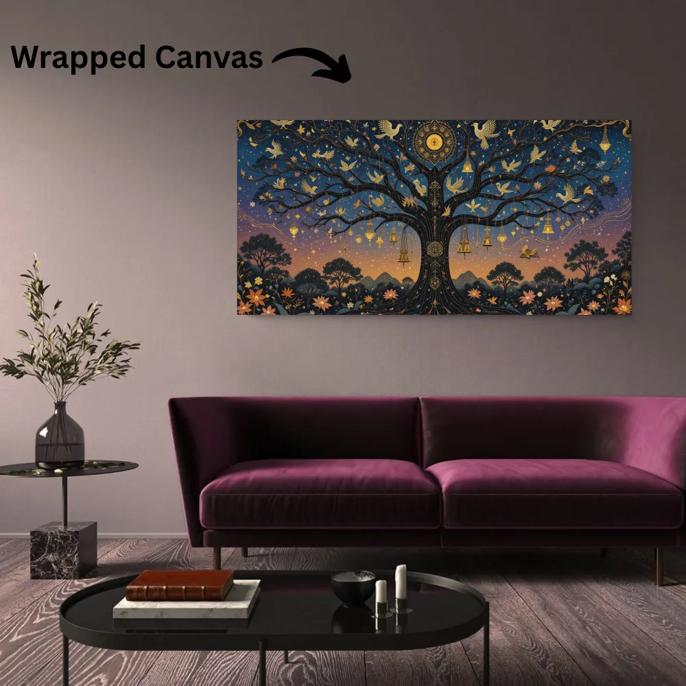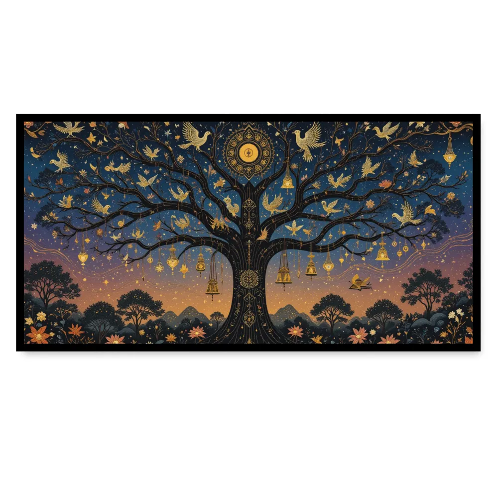 This enchanting artwork beautifully portrays the Tree of Life as a symbol of harmony, wisdom, and spiritual connection. Set against a twilight sky that transitions from warm sunset tones to the deep blues of night, the majestic tree stretches its branches wide, adorned with golden birds, lanterns, and intricate ornaments that radiate light and wonder. Each element—the doves in flight, the flowers in bloom, and the glowing celestial motifs—symbolizes peace, renewal, and the eternal cycle of life. The golden details shimmer against the starry backdrop, creating a dreamlike balance between the earthly and the divine. This piece evokes a sense of serenity and mysticism, inviting the viewer into a realm where nature, spirit, and cosmos unite in perfect harmony.