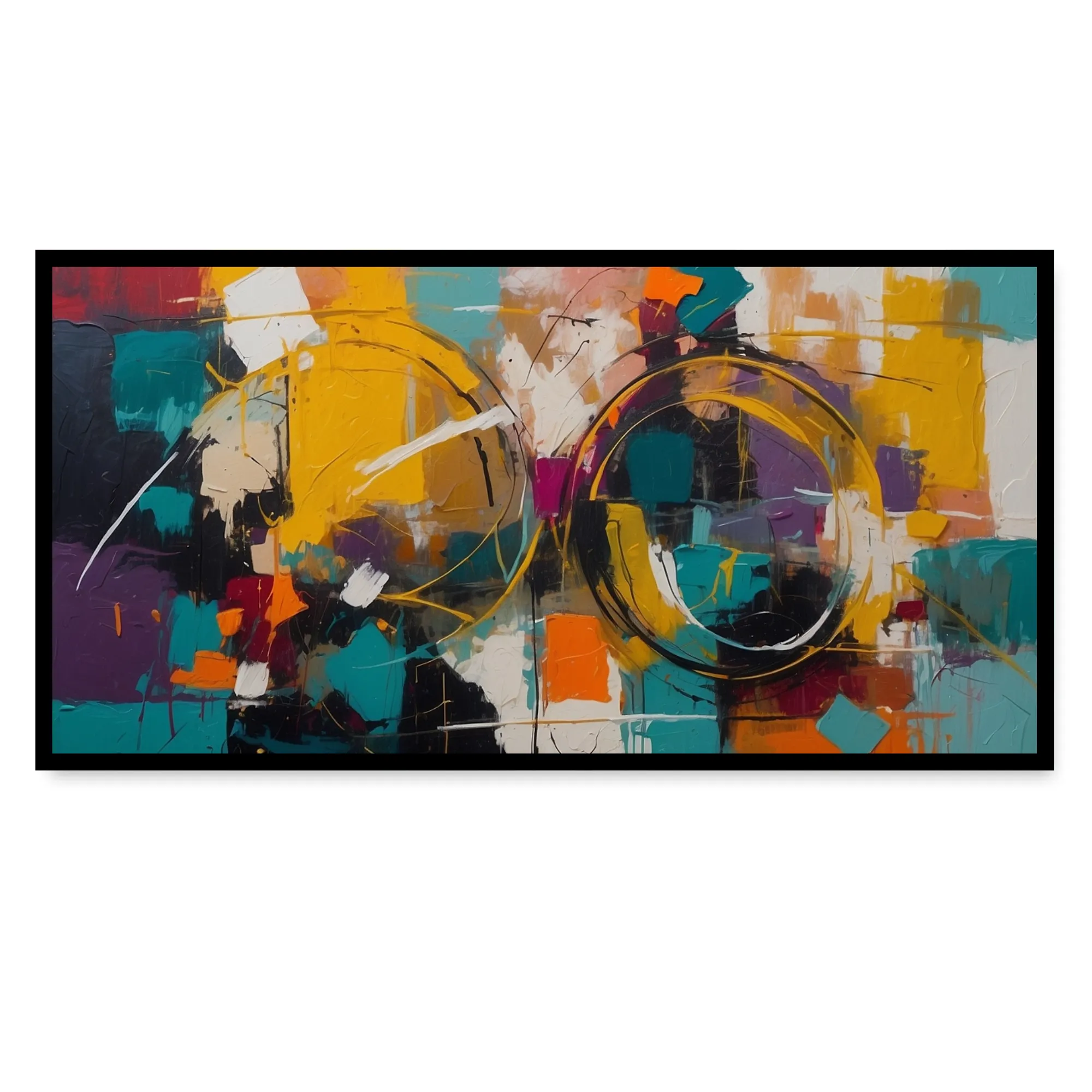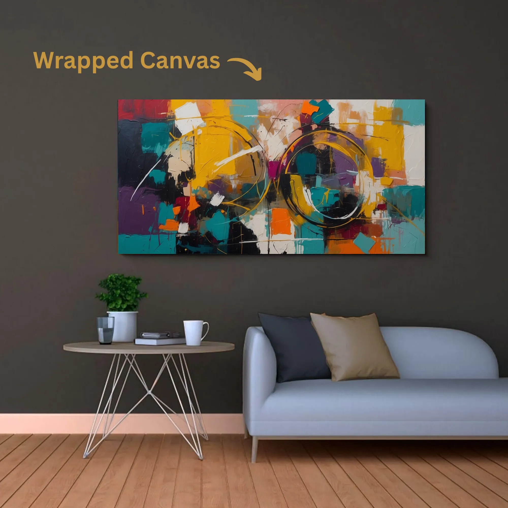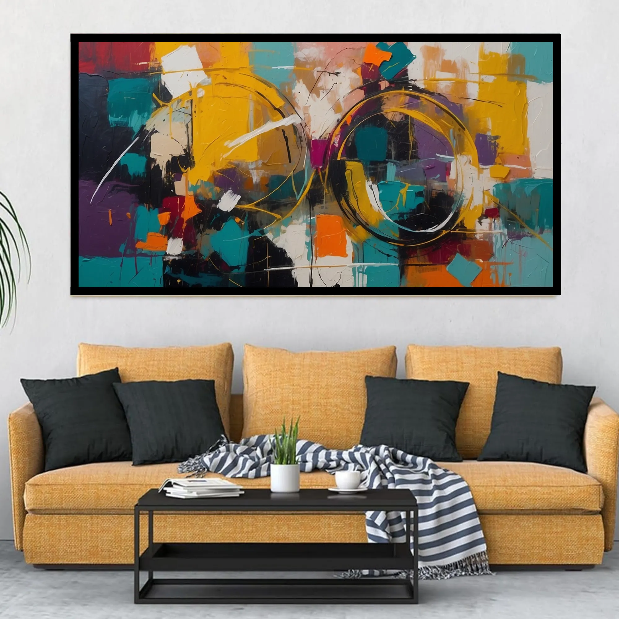 “Vivid Resonance” is a museum-quality cotton canvas art, crafted to bring vibrance, energy, and bold personality into your space. Showcasing large interlocking circle forms and abstract blocks in golden yellow, aqua, orange, plum, and touches of black and cream, this artwork captures a spirit of modern harmony and urban rhythm.